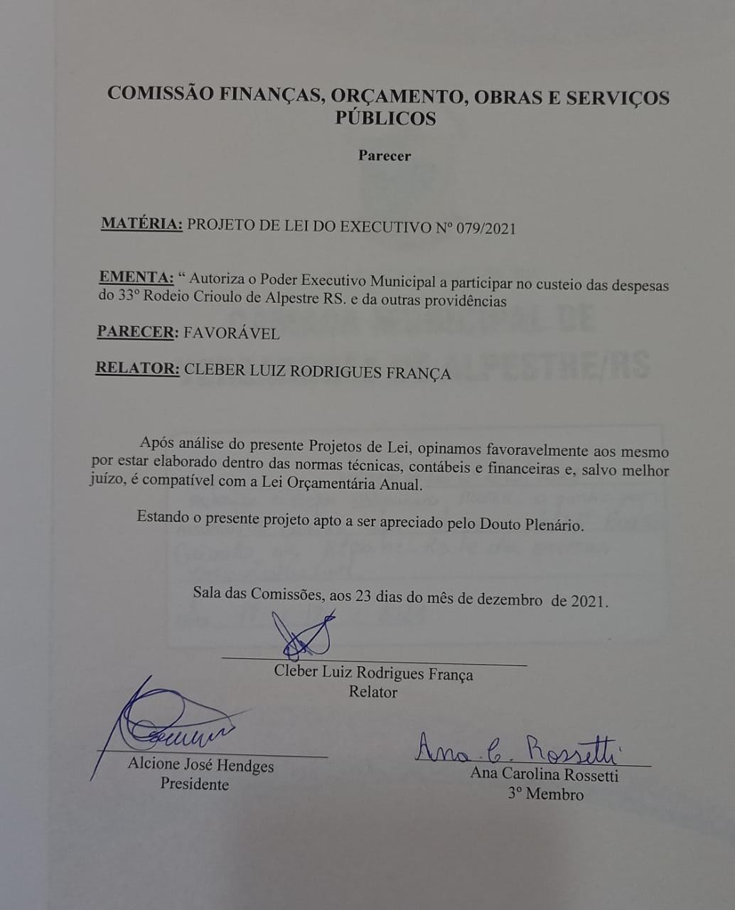 PARECER DA COMISSÃO DE ESTUDO DA CÂMARA DE VEREADORES EXERCÍCIO/2021- 23/12/21
