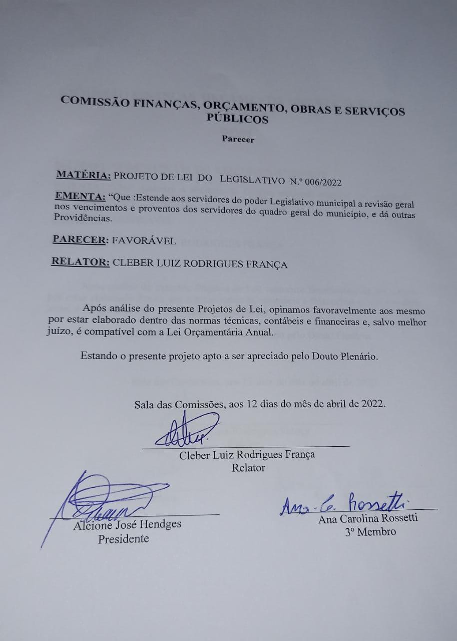 PARECER DA COMISSÃO DE ESTUDO DA CÂMARA DE VEREADORES EXERCÍCIO/2022